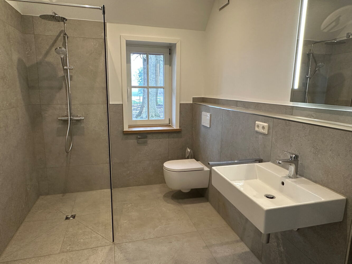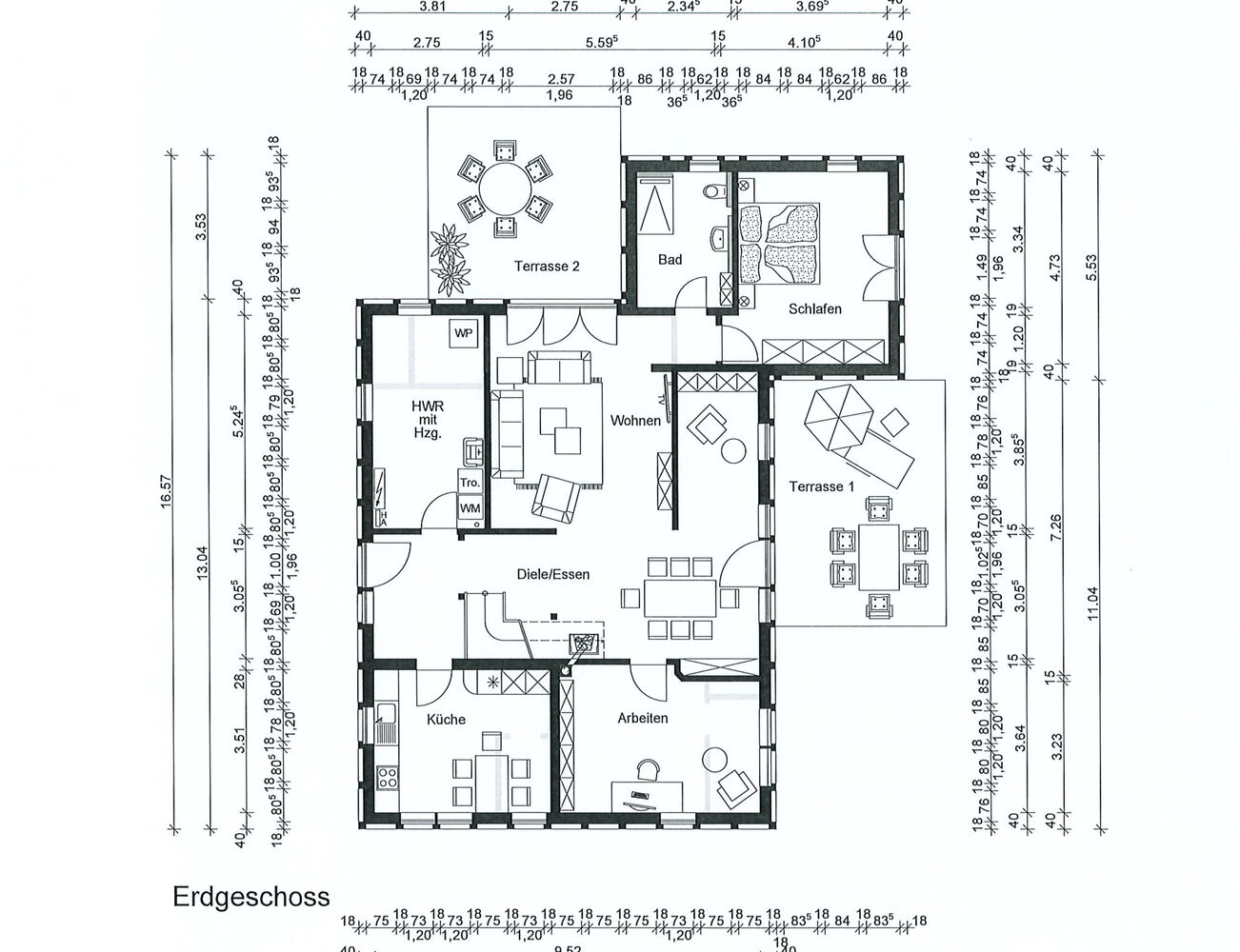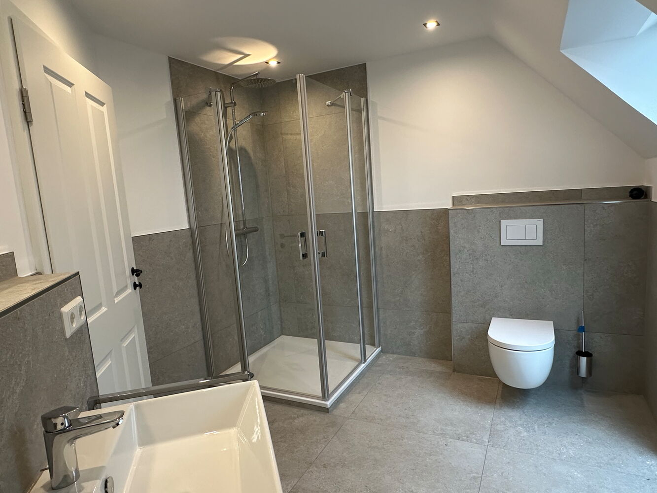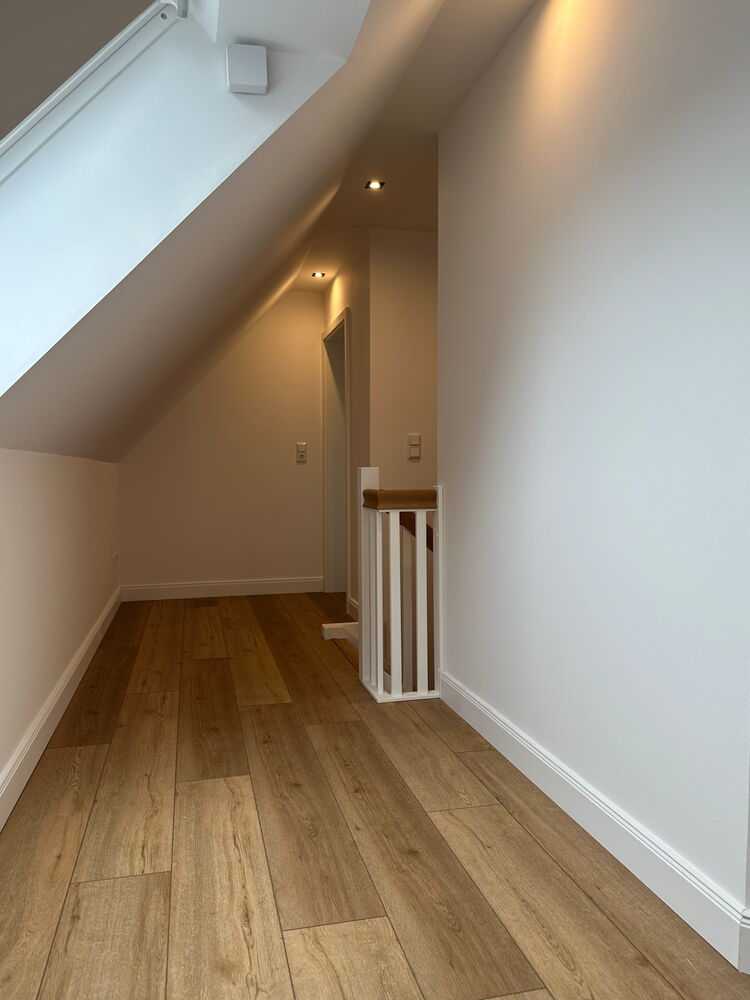 Im Erdgeschoss und im Obergeschoss befindet sich jeweils ein modernes Tageslichtbad mit ebenerdiger Dusche. Der große Hauswirtschaftsraum neben dem Eingang ist praktisch angeordnet und bietet Platz für Waschmaschine, Trockner und zusätzliche Lagerung. Vier weitere Zimmer eignen sich flexibel als Schlaf-, Kinder- oder Arbeitszimmer.
