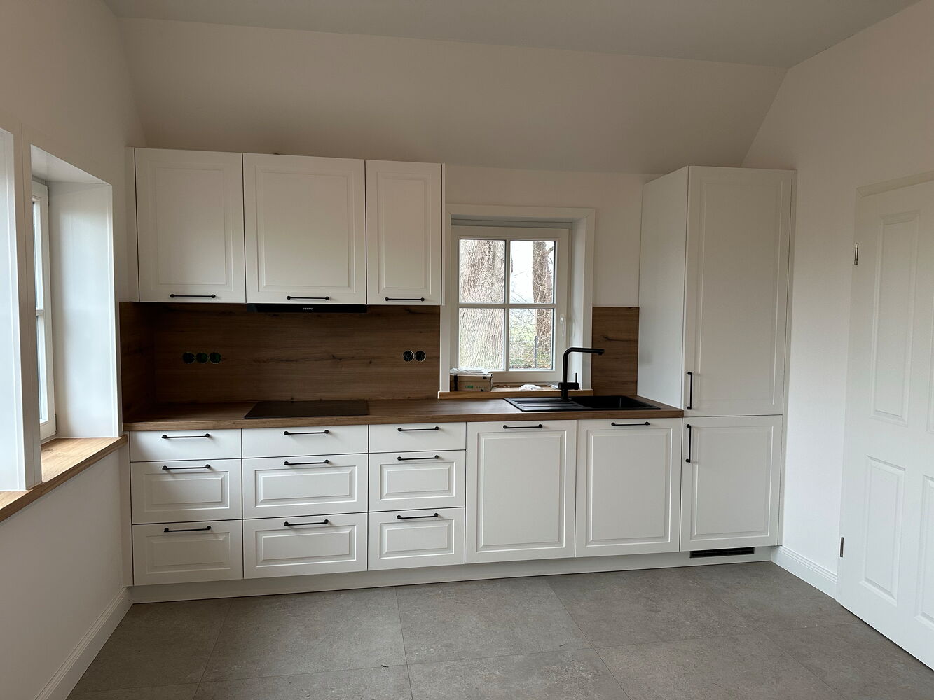 Die helle Einbauküche ist großzügig bemessen und bietet ausreichend Platz zum Kochen und für einen Essbereich.